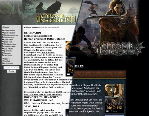 Mit dem neuen großen Roman DER MACHDI erscheint der Auftakt zu einem neuem Serienzyklus (Oktober), im Januar folgt die Premiere der Rockoper Blutnacht mit exklusiv dazu geschriebenem Roman. Und last but not least: Die Chronik Website kommt in neuer Gestaltung und weiteren exklusiven Inhalten daher. Erstes Highlight im Web: Die Leseprobe zu DER MACHDI.