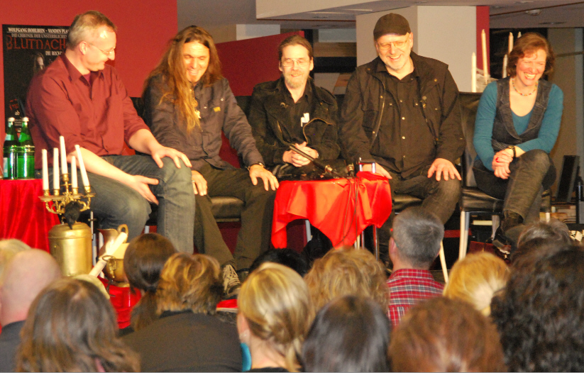 Die BLUTNACHT Premiere endete am 21. Januar nach einer beeindruckenden Vorstellung mit zwanzig Minuten Standing Ovation. Das Foto stammt von der Auftaktveranstaltung am Vortag: Links neben Wolfgang Hohlbein Hauptdarsteller und Komponist Andy Kuntz, rechts Rockoper-Autor Dieter Winkler, außen die Moderatoren Axel Gade und Susanne Bieler. Die nächsten Auf- führungen sind bereits so gut wie ausverkauft, Karten für einzelne Termine aber noch zu haben. Weitere Infos zur Rockoper und Aufführungstermine